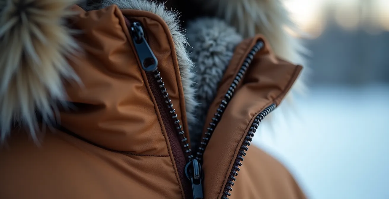 Si l’isolant est le moteur et la membrane la carrosserie, les finitions sont le châssis, le tableau de bord et les joints de votre manteau. Ce sont ces détails, souvent invisibles au premier regard, qui trahissent la qualité d’ingénierie et justifient une part non négligeable du prix. Un manteau bas de gamme peut avoir un bon isolant, mais le froid s’infiltrera par ce que l’on appelle les points de défaillance thermique : les coutures, les fermetures éclair, les poignets et le col.